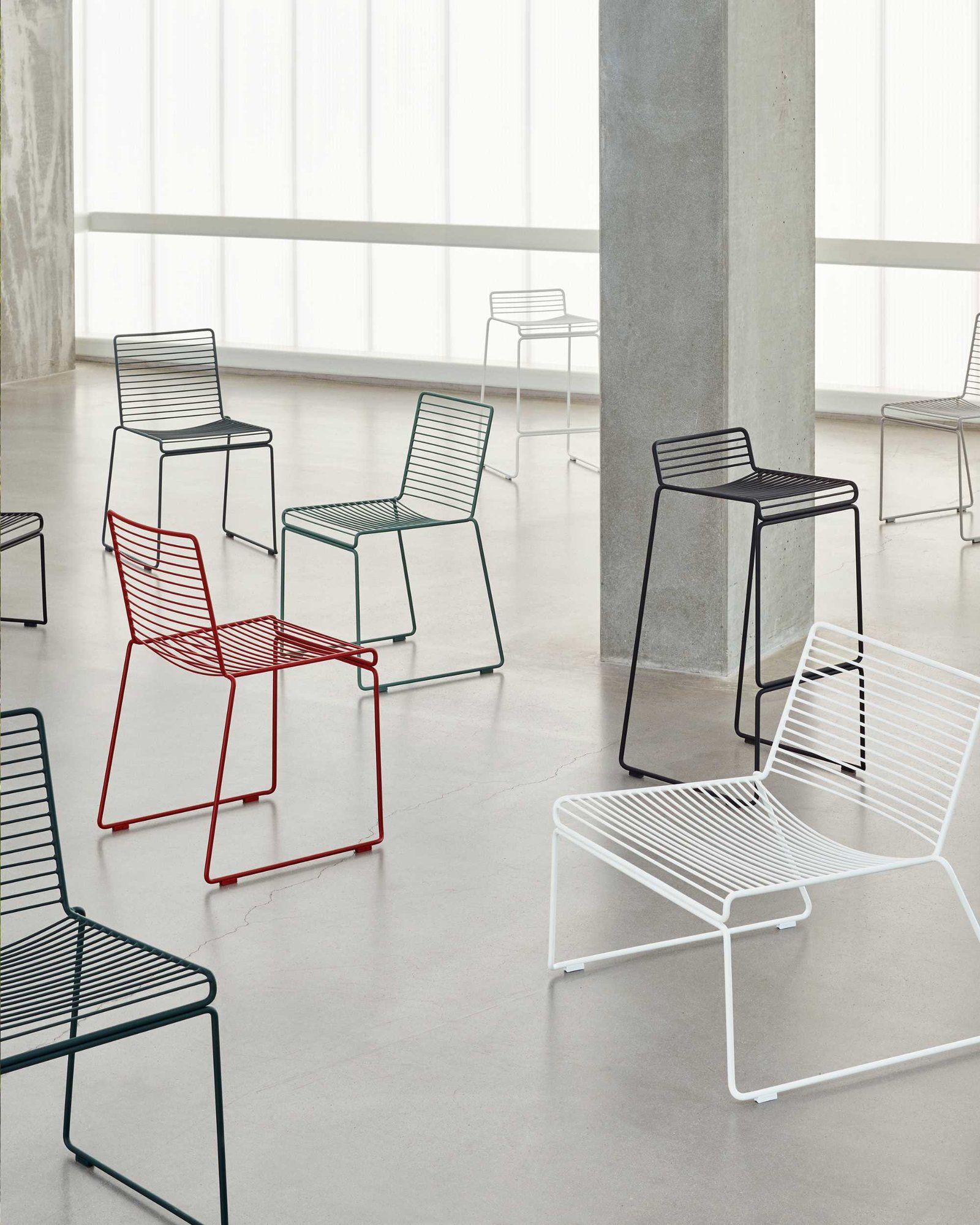 Hee Dining chair is a metal wire in galvanized solid steel which makes it rust-resistant and perfect for outdoor use. The chairs can be linked together in rows for conference use, and the new colour scheme keeps the Hee chairs updated.Material: powder coated steel