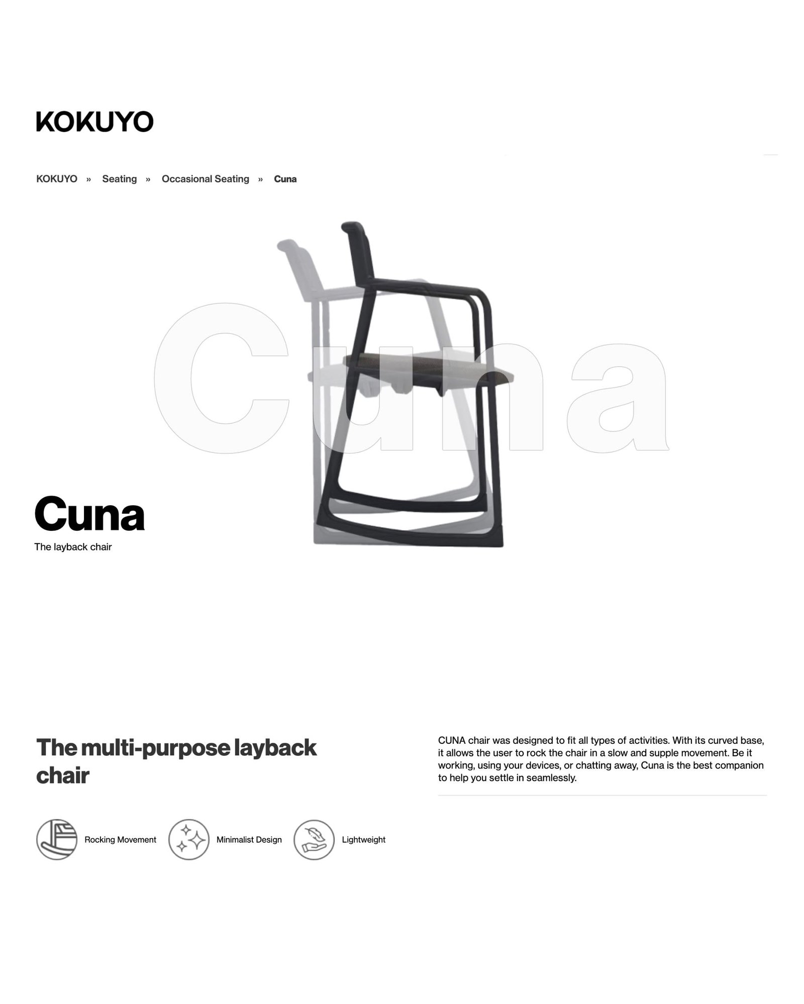 CUNA chair is an ideal relaxation chair that is made and designed in Japan.With the rocking function, gently supports forward leaning, upright, and backward leaning posture.- Designed and Made in Japan- Japanese minimalistic design- Rocking motion- Coated with an anti-bacteria agent. (back rest only)- Suitable for all working surfaces with a table height of 71 – 76cm.- Seat height: 415mmMaterial: polyester/polyester blendDimension: W55.5xD48xH76 cm