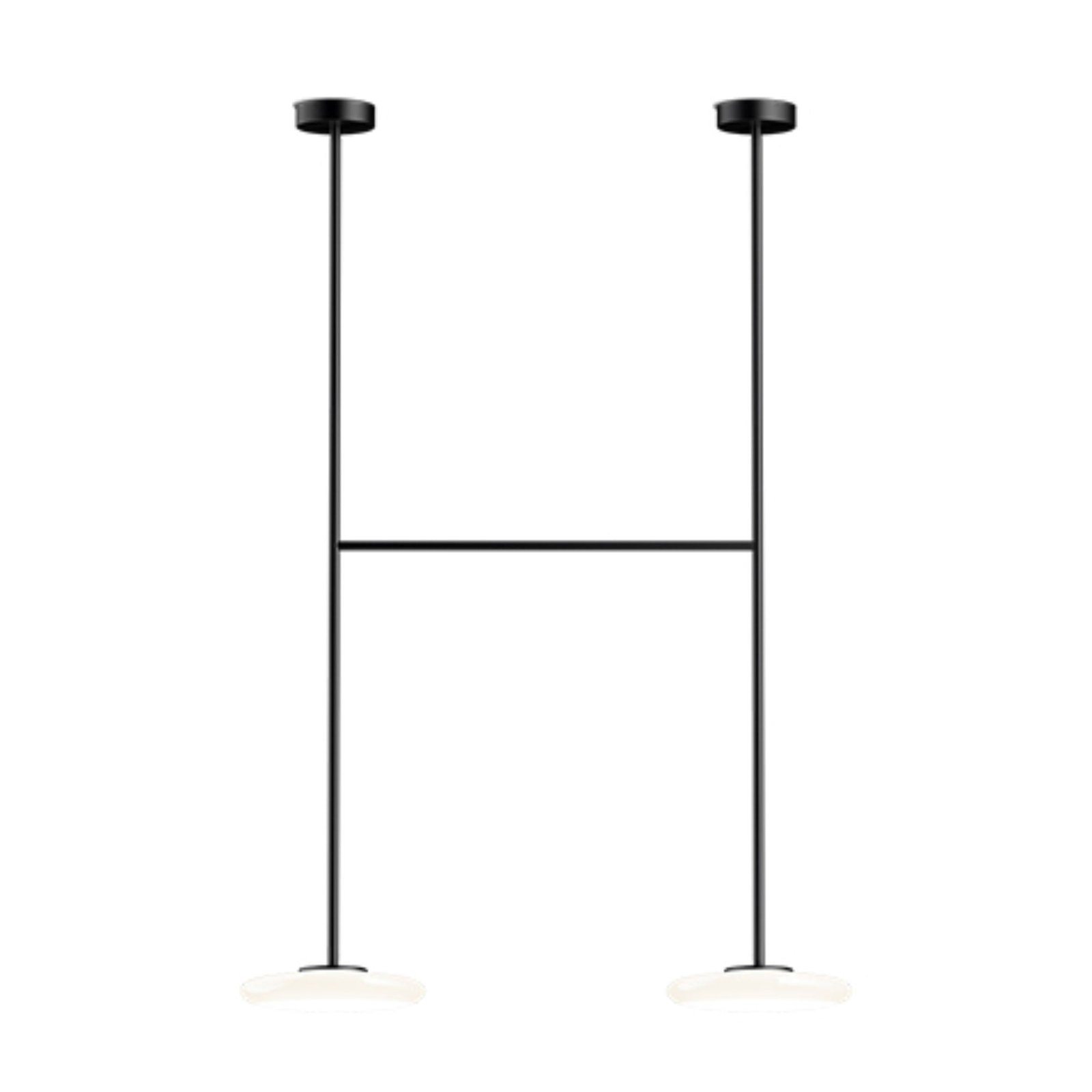 The serene shapes of the Ihana trace out a silhouette of light. This lighting system consists of several opal blown glass diffusers that are pleasing to the eye. appear ductile and contrast with the firmness of the metal structure that determines its shape and fastens it to the ceiling.