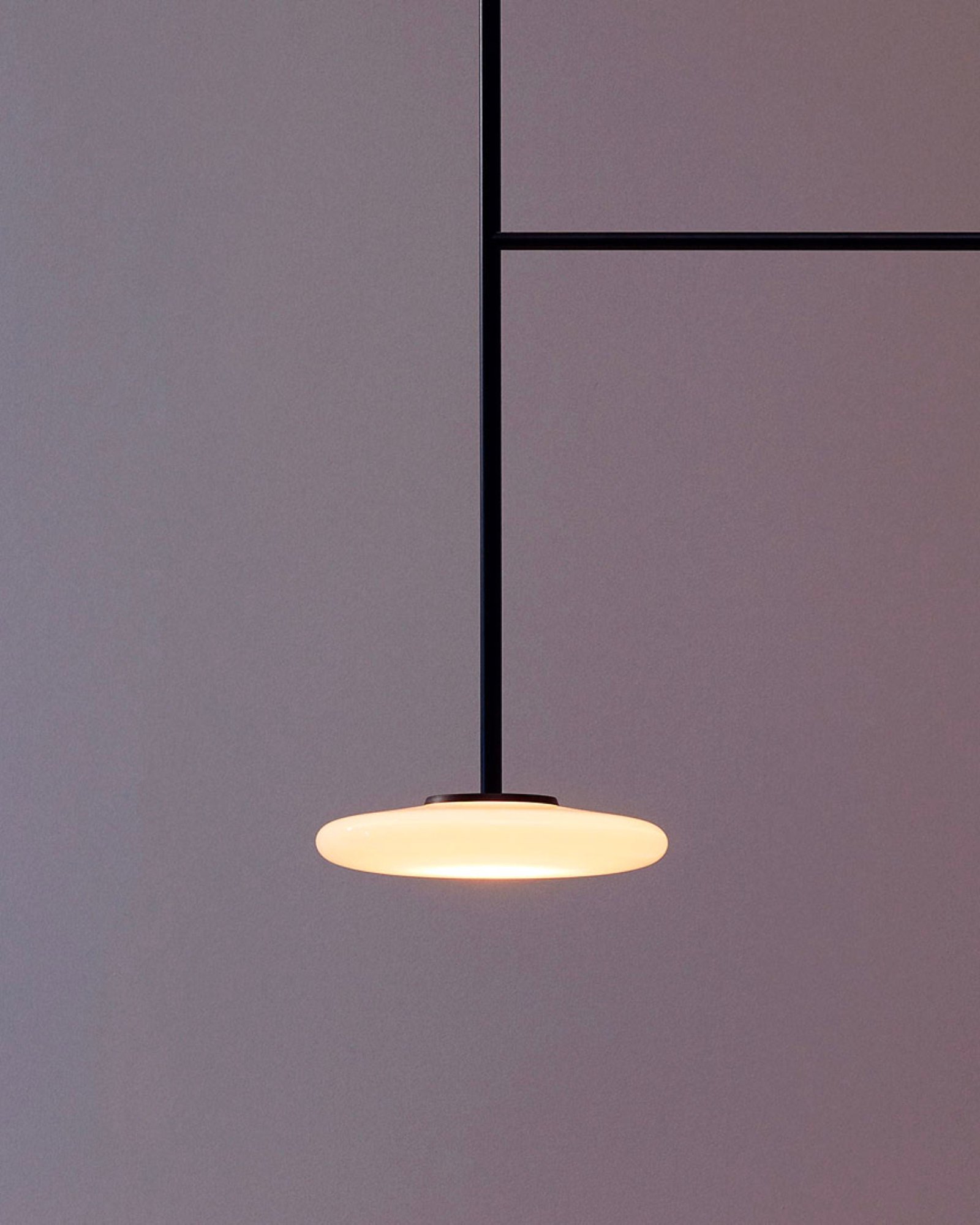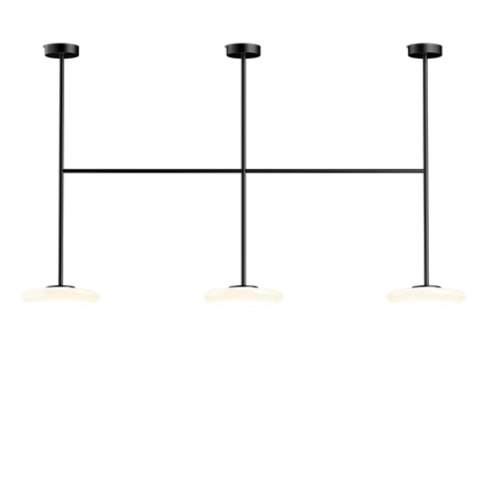 The serene shapes of the Ihana trace out a silhouette of light. This lighting system consists of several opal blown glass diffusers that are pleasing to the eye. appear ductile and contrast with the firmness of the metal structure that determines its shape and fastens it to the ceiling.