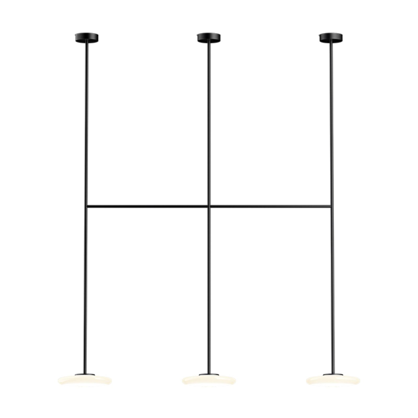 The serene shapes of the Ihana trace out a silhouette of light. This lighting system consists of several opal blown glass diffusers that are pleasing to the eye. appear ductile and contrast with the firmness of the metal structure that determines its shape and fastens it to the ceiling.