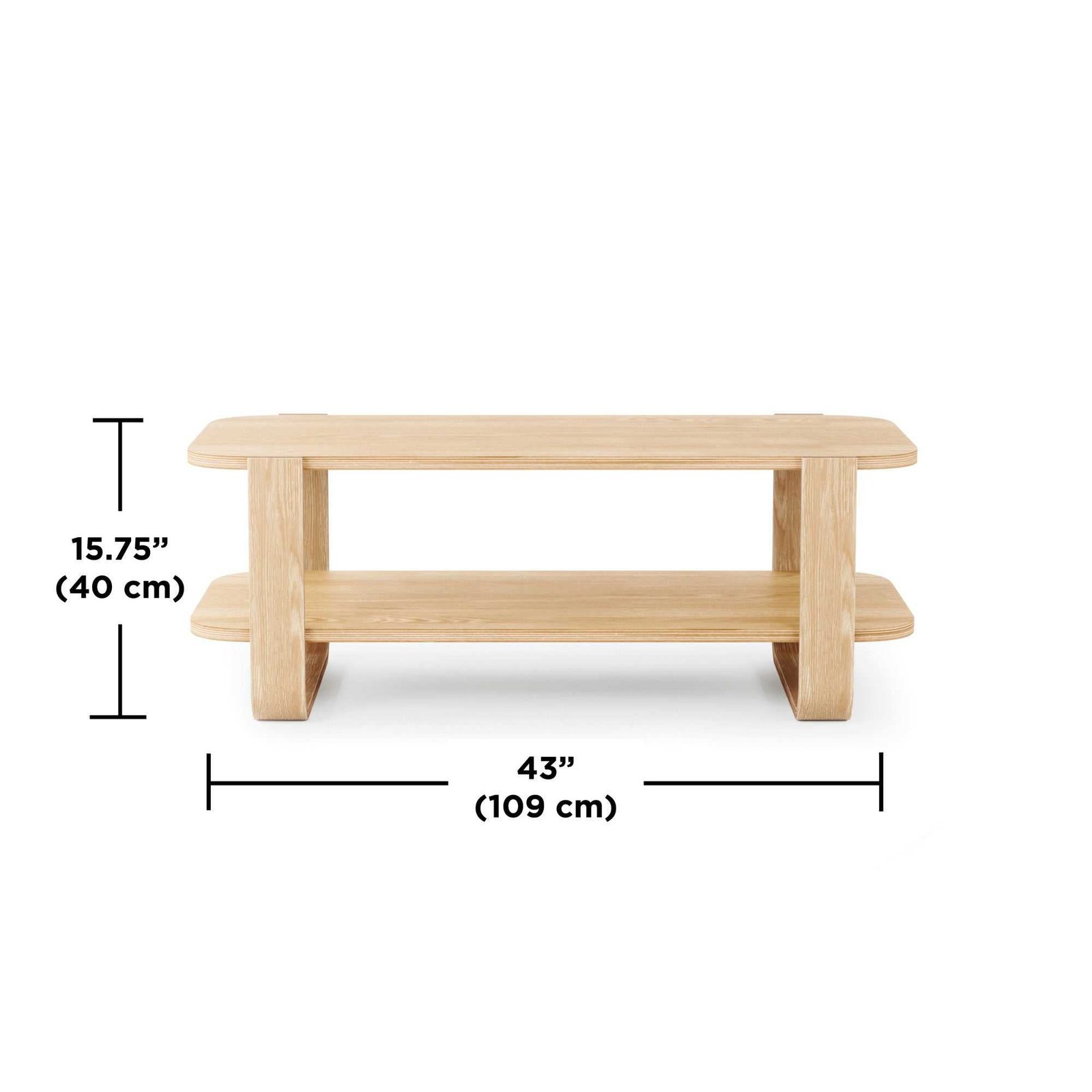 With soft bent-wood legs and two open tiers, Bellwood brings a warm and airy touch to your living room, bedroom or entryway. This versatile coffee table seamlessly accompanies your space to provide multipurpose storage. – Holds up to approx. 397lbs (180 kg)- Its two tiers allow you to store plants, decor, remotes and more.Material: plywoodDimension: w55 x d109 x h40 cm